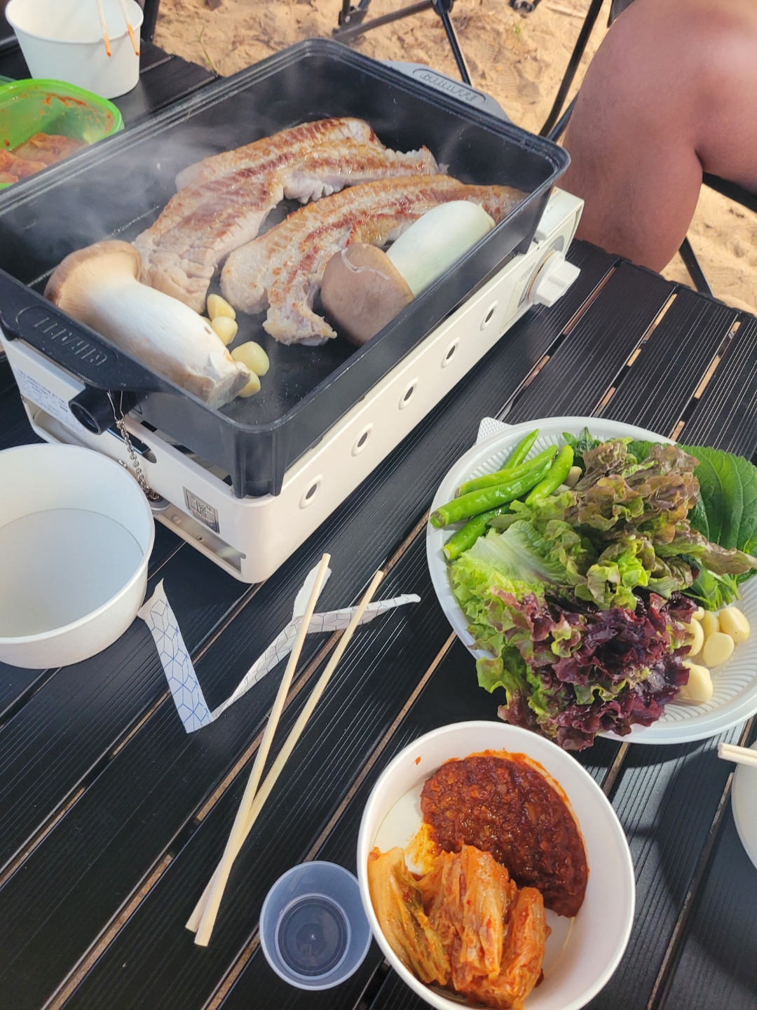 이날 먹은 거는 삼겹살, 목살, 떡갈비, 떡볶이, 어묵탕, 모둠회, 우럭구이, 매운탕, 양장피 등등 등 과일과 과자도 있었음